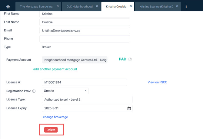 - Verify all information and use the delete button to delete the broker staff with no loan associated