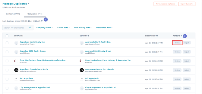 In the Manage Duplicates window, you'll see a list of company records identified by HubSpot as potential duplicates. Click Review next to each set of duplicates to examine the records and determine the appropriate actions.