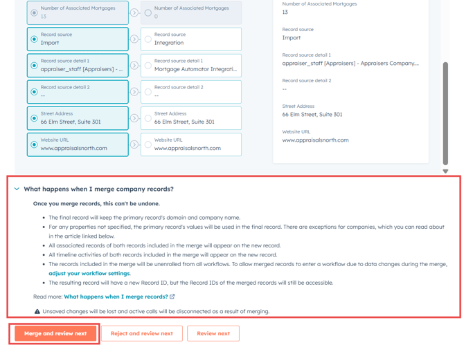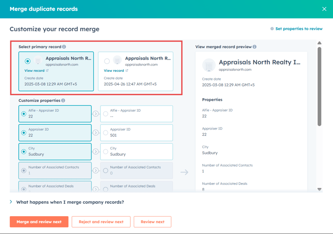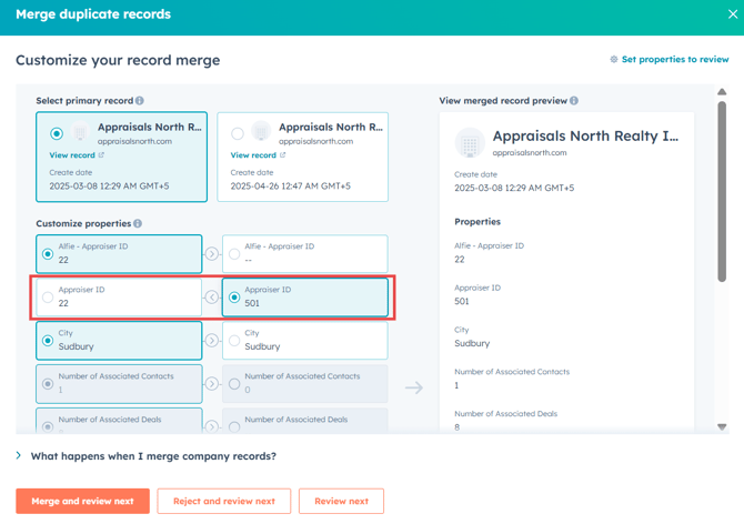 Review Custom Properties: Carefully compare custom properties from each record. You have the flexibility to select which specific property data you'd like to retain from each company.