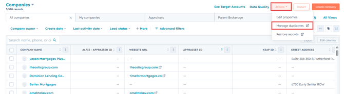 On the Companies dashboard, click the Actions dropdown menu and select Manage Duplicates.