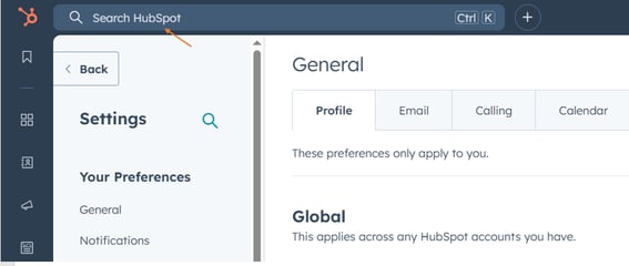 Step 4: Navigate to HubSpot, locate the Global Search Bar at the top of the interface.