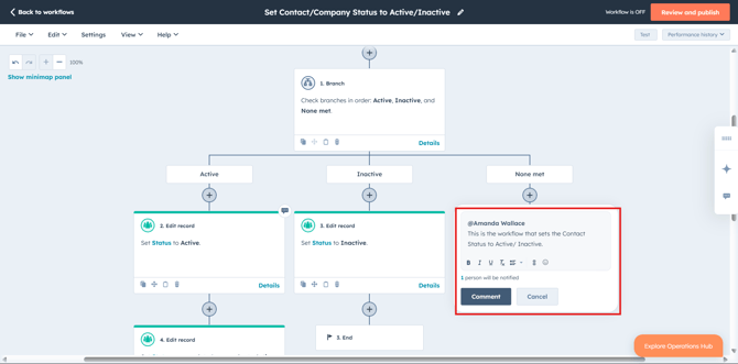 - In workflows, you can add comments to all workflow actions including If/Then branches. Click on the Comment icon on top of the action on which you want to add comment.